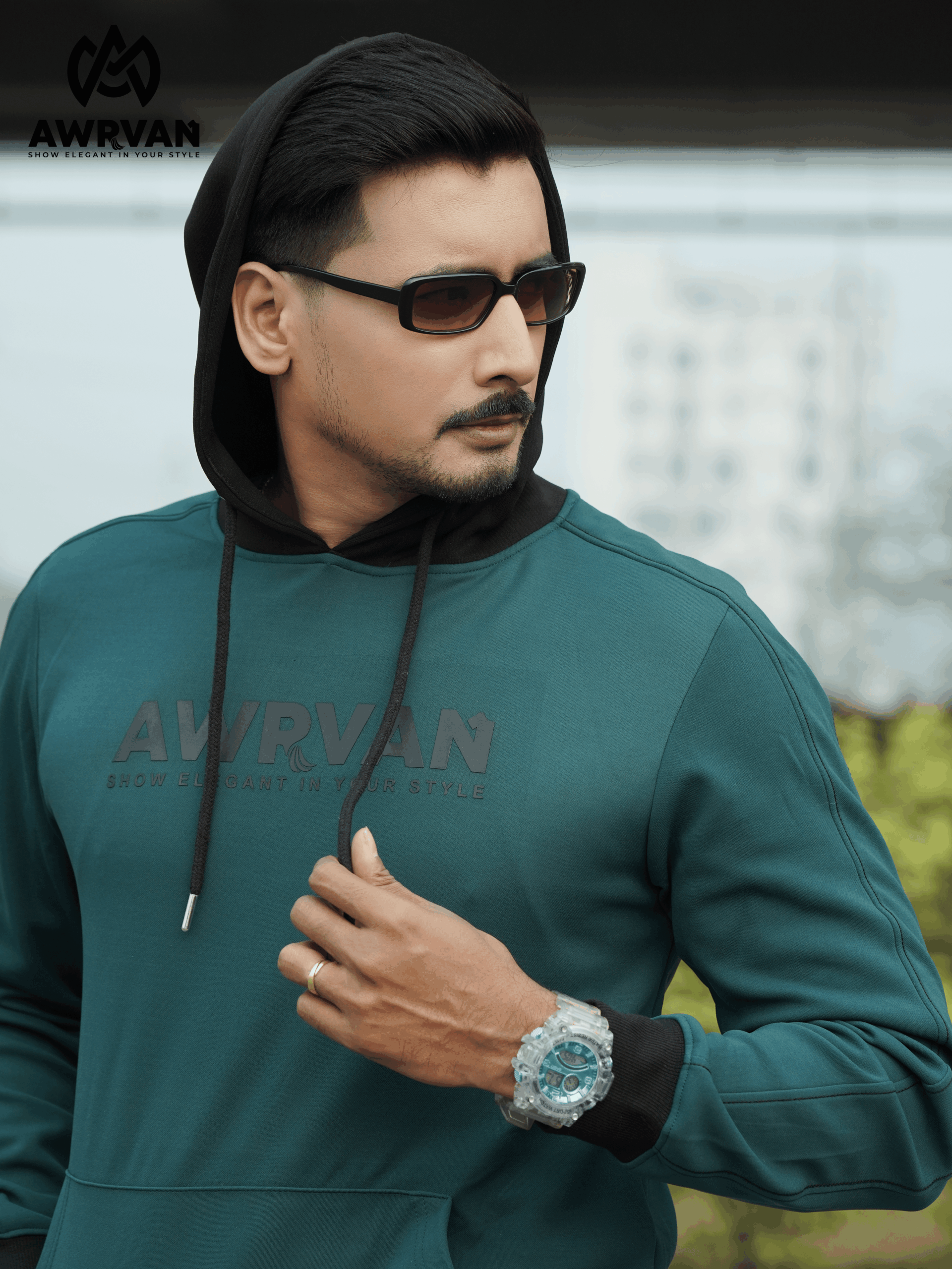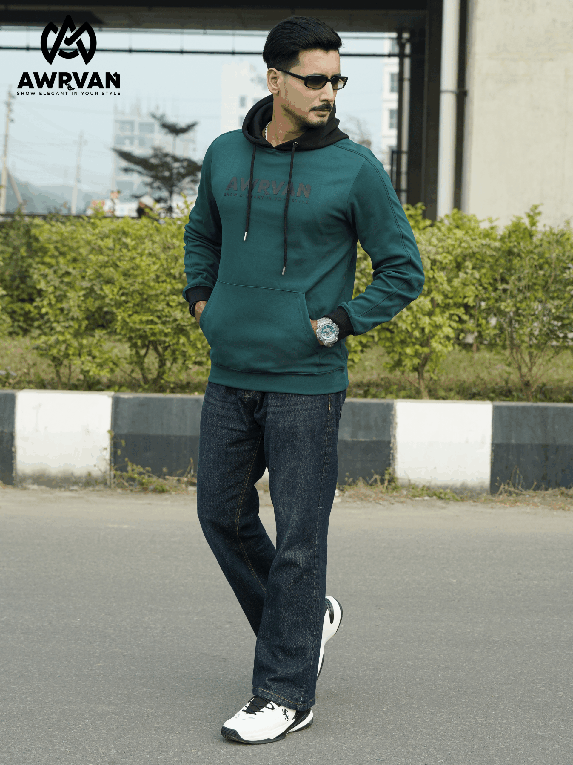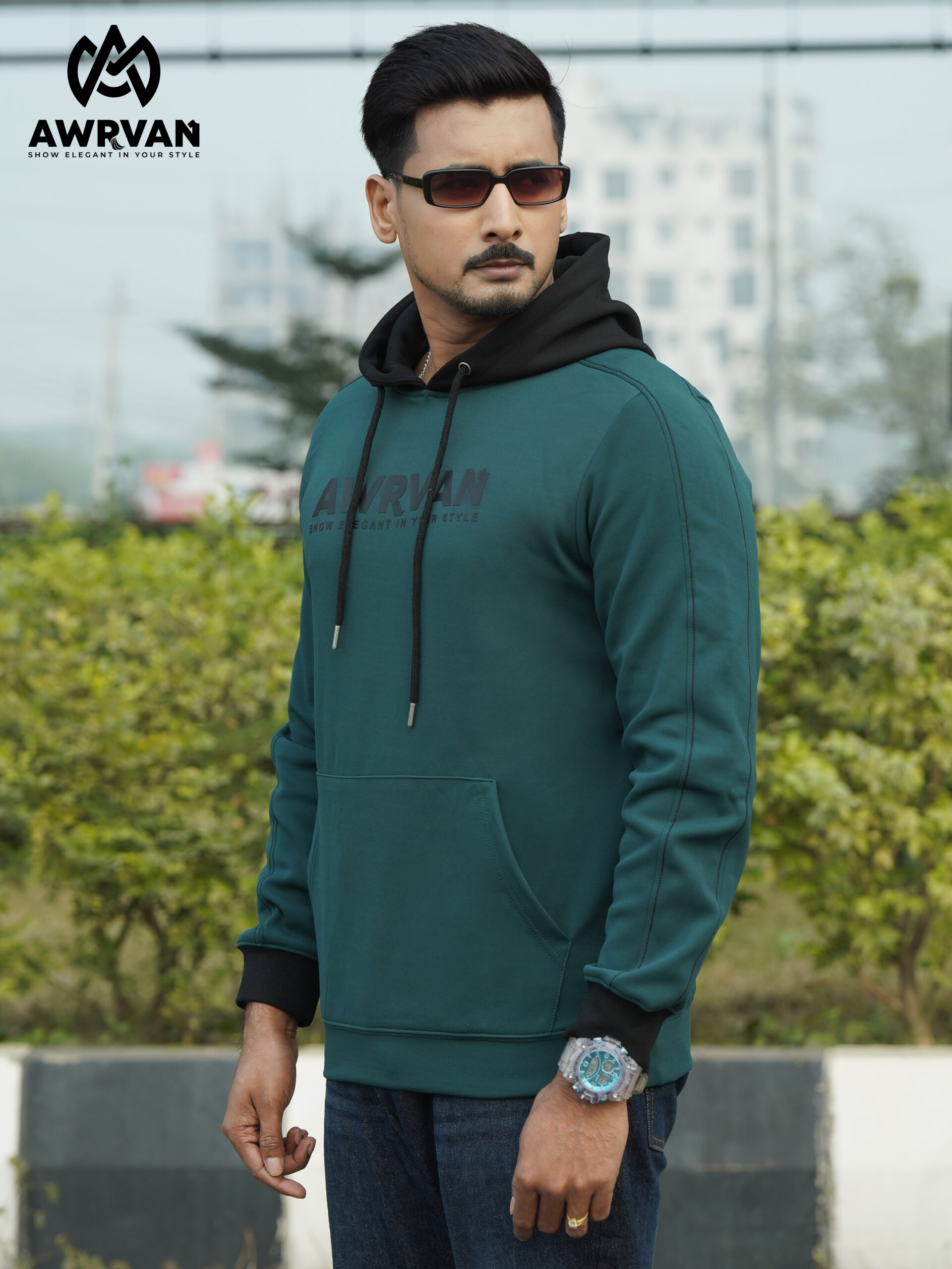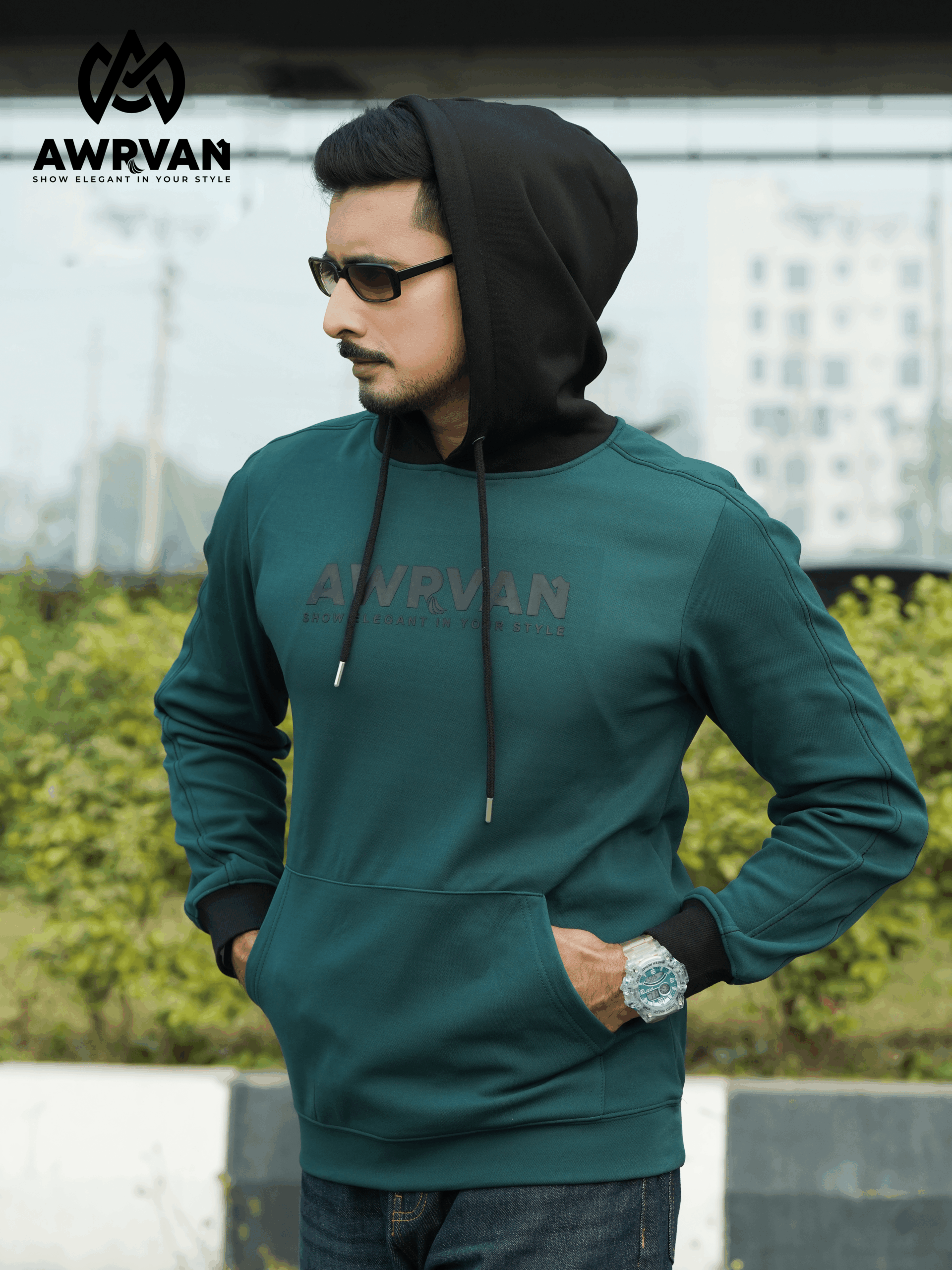 The hoodie is made of high-quality China fabric, which makes it very comfortable to wear. Our hoodie has an extra-cutting fabric design on the sleeves, which is sewn with black thread from above. The body of the hoodie is petrol green, the hood and cuffs are black, which changes the look of the hoodie and brings elegance. The hoodie has Awrvan branding on the chest on the front of the site, which is a 7-inch skin print. The hoodie has high-quality ribs, drawstrings and eyelets. Each hoodie will be wrapped in poly and will have silicone to prevent moisture.